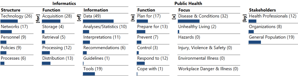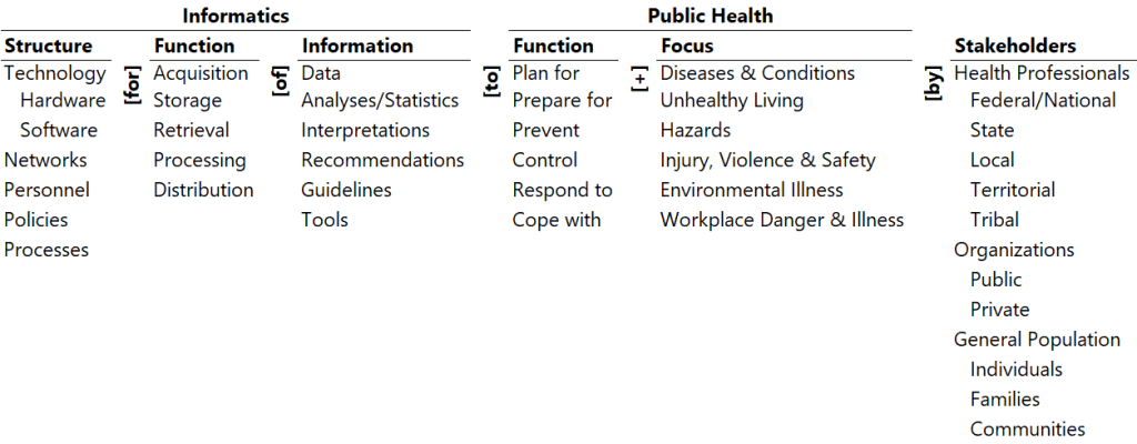 The complexity of public health informatics is captured in an ontology using the ontological meta-analysis and design methodology. The mapping of extent literature identifies gaps in research on public health informatics.