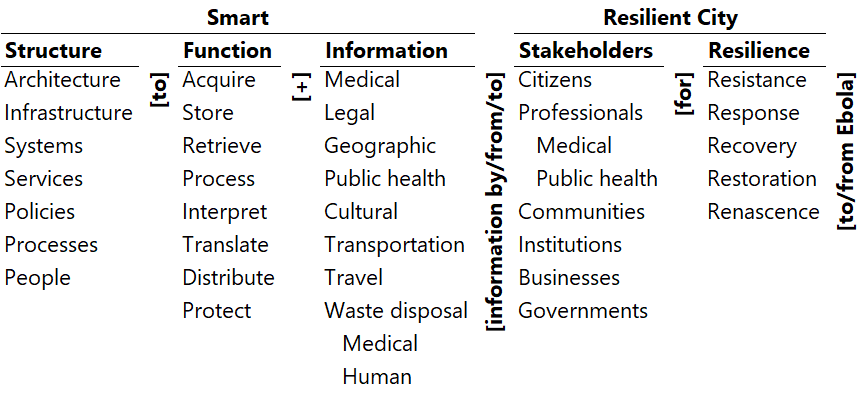 Managing information is central to a smart city’s resiliency. The ontological framework reveals pathways to managing information in smart cities dealing with threats such as Ebola epidemic.
