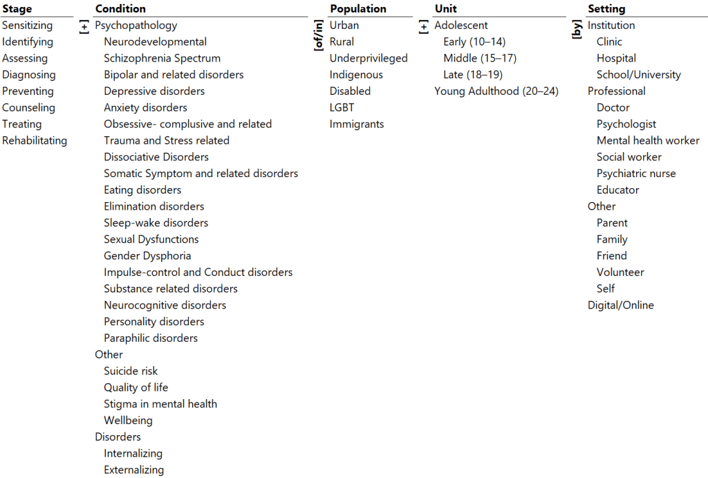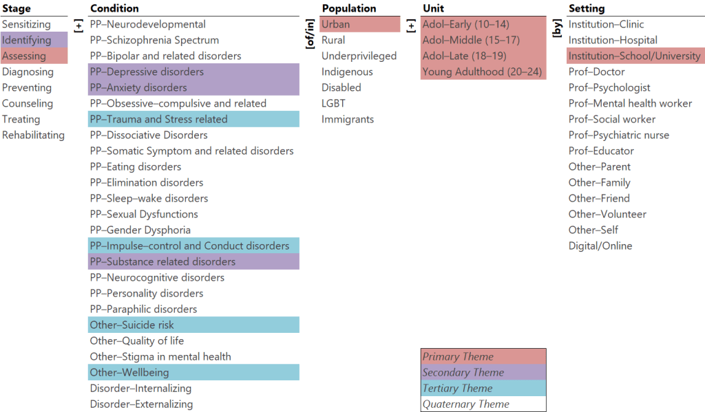 The state of mental health research in adolescents and youth, especially in contexts of limited resources, is mapped illustrated in the ontological framework.